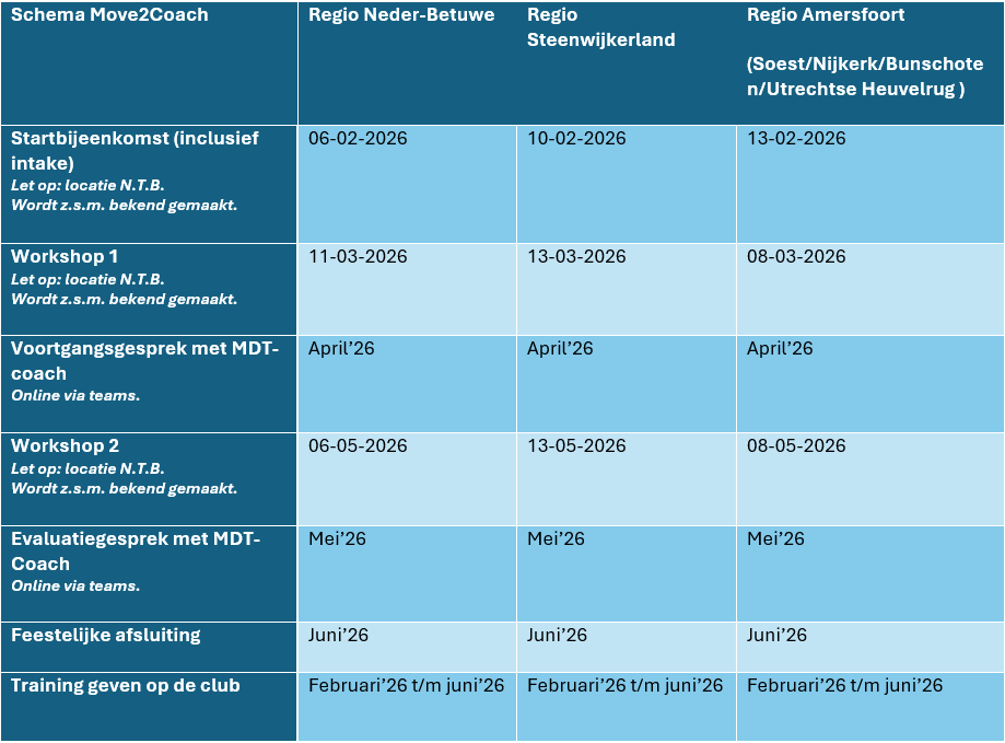 Move2Coach is een project speciaal ontwikkeld voor jongeren (tussen de 12 en 30 jaar) die trainer willen worden of zich verder willen ontwikkelen als trainer. Met dit programma krijgen jongeren de kans om samen met andere jongeren uit de regio te leren over de pedagogische en didactische kant van het trainen. Zo ontwikkelen ze zichzelf, dragen ze bij aan de club en wordt het trainerskorps van jouw vereniging versterkt.
